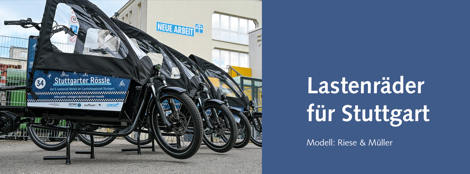 Das Sozialunternehmen NEUE ARBEIT gGmbH organisiert im Auftrag der Landeshauptstadt Stuttgart den langfristigen Verleih von 100 E-Lastenrädern. Die sogenannten „Stuttgarter Rössle“ sind hochwertige einspurige, zweirädrige E-Lastenräder mit zwei 5-Punkt-Gurten gesicherten Kinderplätzen.
